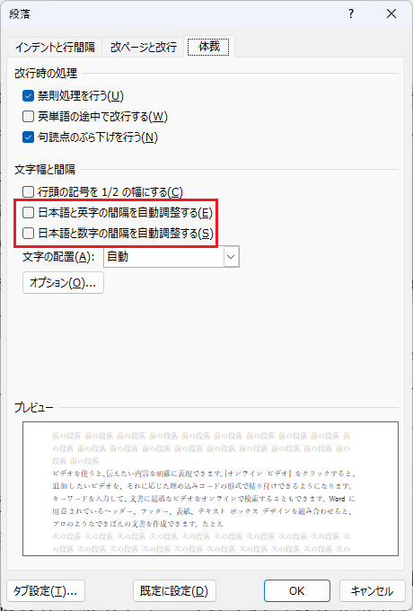 右クリック → 段田 → 体裁で、次の設定を行う。